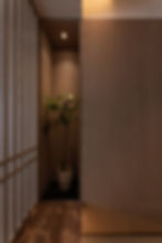The lattice sliding door balances transparency and opacity, allowing light to diffuse gently into the foyer. It is also a shared door panel to the display cabinet, allowing adaptability for the homeowners to conceal or reveal their sake collection for different occasions when hosting gatherings.